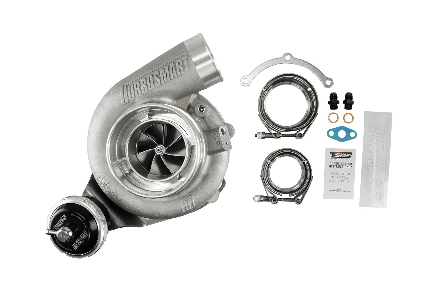 Every Turbosmart turbocharger comes standard with everything you need for installation, weld flanges, V-band clamps, gaskets, oil feed and drain fittings as well as water feed and return fittings are included.