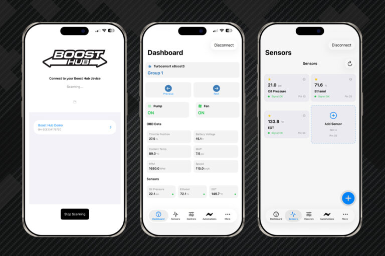 Modern modified vehicles accumulate multiple aftermarket electronics like boost controllers, water-meth controllers, auxiliary fuel pumps, scavenge pumps, fans, lights, ethanol content sensors, and dataloggers. When the OEM ECU is controlling the engine, each of these components must be managed through its own app, dial, or hard-wired switch, and very few of them communicate with each other or with the car’s OBD II/CAN data. BoostHub solves this by centralising inputs, control, and automation in a single system.