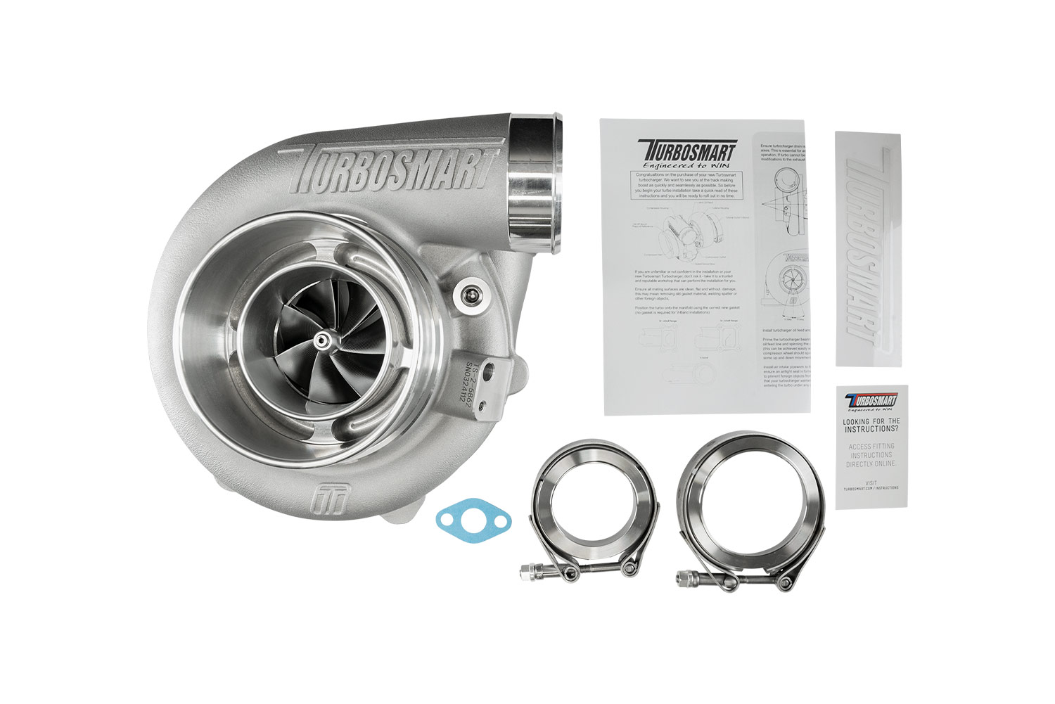 Every Turbosmart turbocharger comes standard with everything you need for installation, weld flanges, V-band clamps, gaskets, oil feed and drain fittings as well as water feed and return fittings are included.